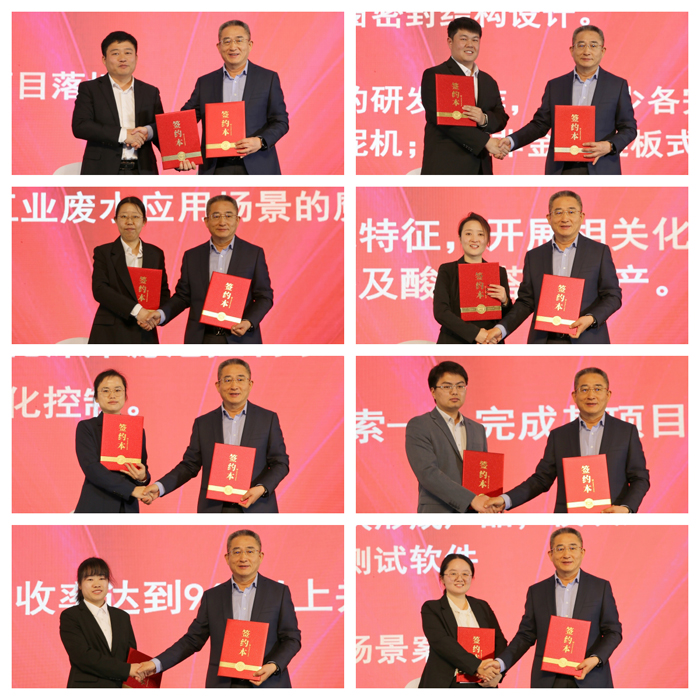 盛典在市經(jīng)開區(qū)管委會副主任方強的致辭中拉開了帷幕,在接下來的產(chǎn)品推介會上,來自裝配式水廠、深床反硝化濾池系統(tǒng)、高效/磁混凝系統(tǒng)、BAF智慧工藝、臭廢氣收集及處理系統(tǒng)、工業(yè)物聯(lián)智能控制產(chǎn)品及系統(tǒng)、魔方智水產(chǎn)品、環(huán)保非標(biāo)設(shè)備八個團隊的產(chǎn)品經(jīng)理從市場角度出發(fā),分享了各自技術(shù)化產(chǎn)品的新功能、新亮點以及產(chǎn)生的效益,并規(guī)劃了2025年的市場工作、產(chǎn)品應(yīng)用場景擴展、升級的思路及目標(biāo)。隨后,會議舉行了八位產(chǎn)品經(jīng)理與副董事長鄭俊簽約及市場銷售人員誓師儀式。