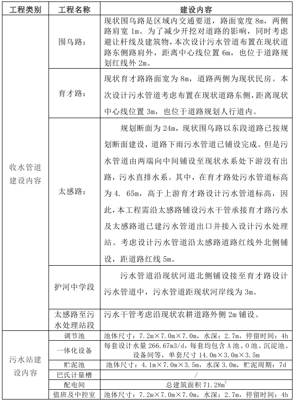本項目新建污水處理站一座,規(guī)模為800t/d。新建污水管網(wǎng)5.75公里,管徑為DN400-DN600,采用開挖、牽引相結(jié)合的施工方式。建設(shè)項目工程組成見表1。