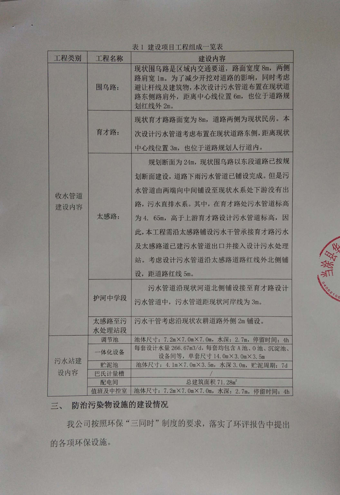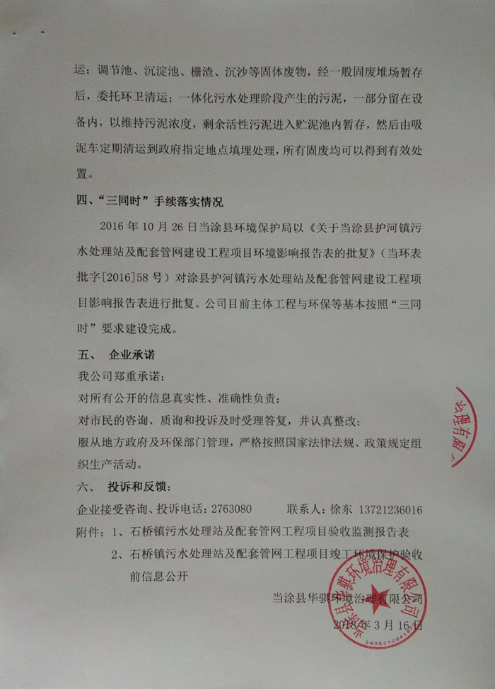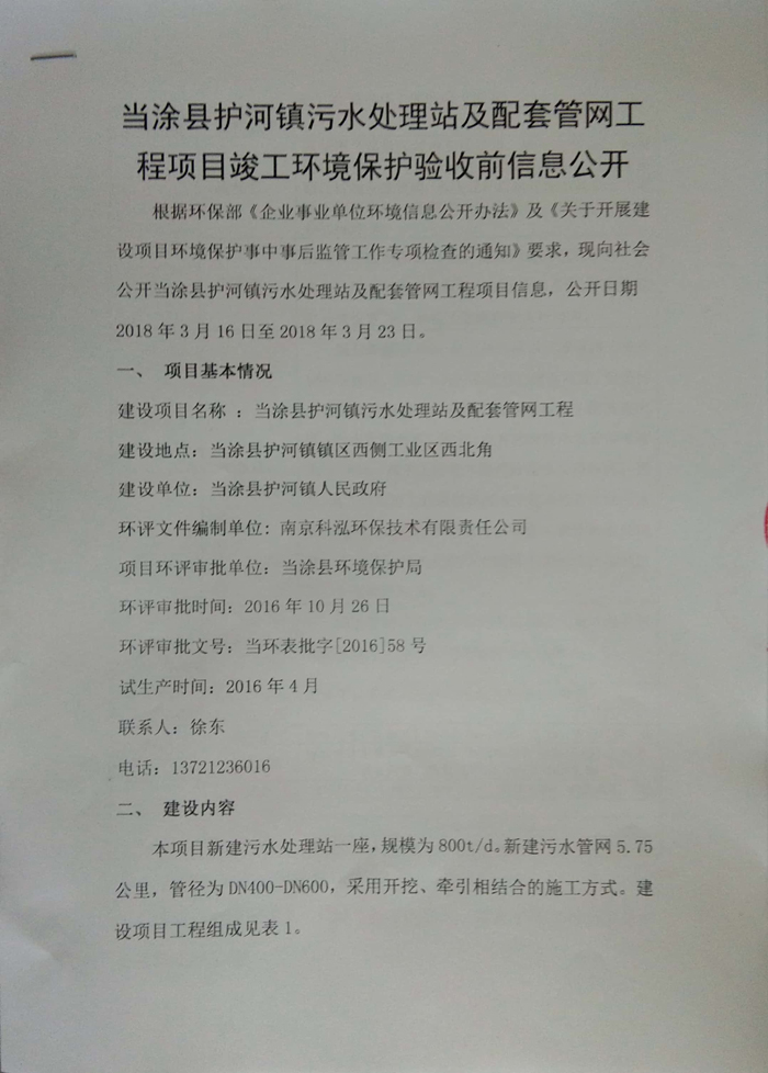 2016年10月26日當(dāng)涂縣環(huán)境保護(hù)局以《關(guān)于當(dāng)涂縣護(hù)河鎮(zhèn)污水處理站及配套管網(wǎng)建設(shè)工程項目環(huán)境影響報告表的批復(fù)》(當(dāng)環(huán)表批字[2016]58號)對涂縣護(hù)河鎮(zhèn)污水處理站及配套管網(wǎng)建設(shè)工程項目影響報告表進(jìn)行批復(fù)。公司目前主體工程與環(huán)保等基本按照“三同時”要求建設(shè)完成。