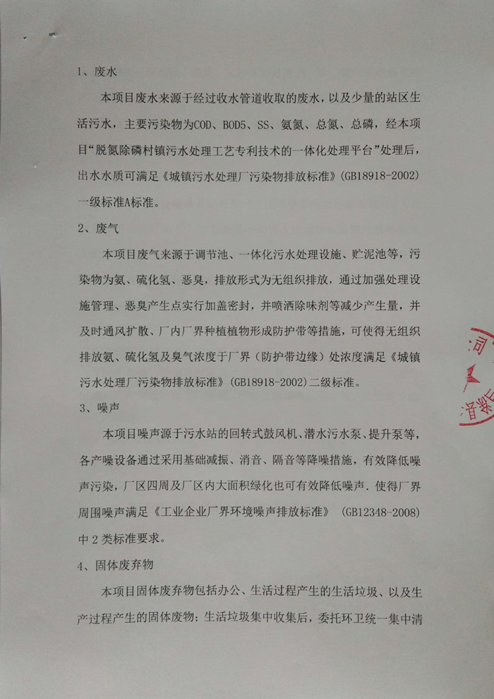 本項(xiàng)目廢水來(lái)源于經(jīng)過(guò)收水管道收取的廢水,以及少量的站區(qū)生活污水,主要污染物為COD、BOD5、SS、氨氮、總氮、總磷,經(jīng)本項(xiàng)目“脫氮除磷村鎮(zhèn)污水處理工藝專利技術(shù)的一體化處理平臺(tái)”處理后,出水水質(zhì)可滿足《城鎮(zhèn)污水處理廠污染物排放標(biāo)準(zhǔn)》(GB18918-2002)一級(jí)標(biāo)準(zhǔn)A標(biāo)準(zhǔn)。