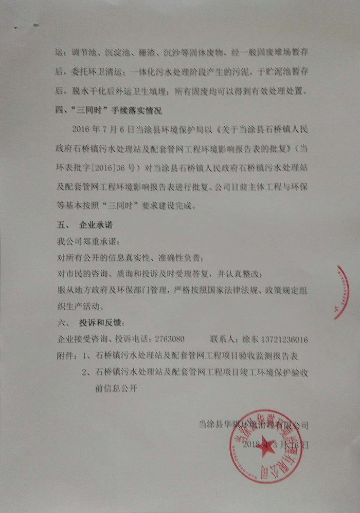 2016年7月6日當(dāng)涂縣環(huán)境保護(hù)局以《關(guān)于當(dāng)涂縣石橋鎮(zhèn)人民政府石橋鎮(zhèn)污水處理站及配套管網(wǎng)工程環(huán)境影響報(bào)告表的批復(fù)》(當(dāng)環(huán)表批字[2016]36號(hào))對(duì)當(dāng)涂縣石橋鎮(zhèn)人民政府石橋鎮(zhèn)污水處理站及配套管網(wǎng)工程環(huán)境影響報(bào)告表進(jìn)行批復(fù)。公司目前主體工程與環(huán)保等基本按照“三同時(shí)”要求建設(shè)完成。