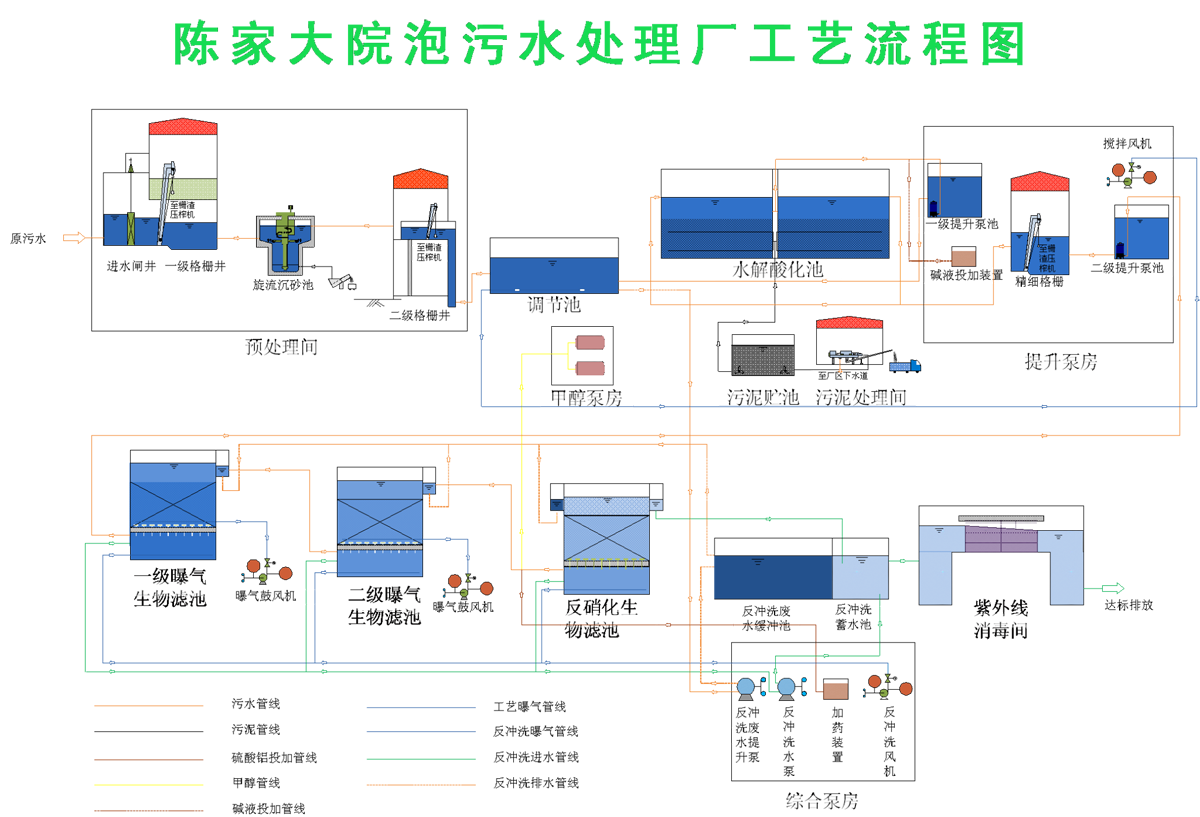 該污水處理廠主體工藝由預(yù)處理間、調(diào)節(jié)池、提升泵房、水解酸化池、一級曝氣生物濾池、二級曝氣生物濾池和反硝化生物濾池、紫外線消毒間等構(gòu)筑物組成。其中曝氣生物濾池采用我公司專利技術(shù)“后置反硝化脫氮工藝”。出水水質(zhì)可達到國家《城鎮(zhèn)污水處理廠污染物排放標(biāo)準(zhǔn)》(GB18918-2002)中的一級A類標(biāo)準(zhǔn)。