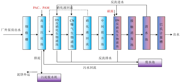馬鞍山城鎮(zhèn)南部污水處理廠規(guī)劃設(shè)計總規(guī)模9.5萬噸/天,現(xiàn)狀規(guī)模只能處理4.5萬噸/天。根據(jù)現(xiàn)狀進水水量監(jiān)測,其水量已超過目前污水處理廠處理量的20%,須對馬鞍山城鎮(zhèn)南部污水處理廠擴建,擴建處理規(guī)模5萬噸/天污水處理廠一座。本工程采用先進的“高效沉淀池+中置硝化三級生物濾池”的組合工藝,再經(jīng)過末端處理出水達到“準Ⅳ類標準”后排放至朝陽溝。本工程脫水后污泥(80%)運至指定地點進行處置。